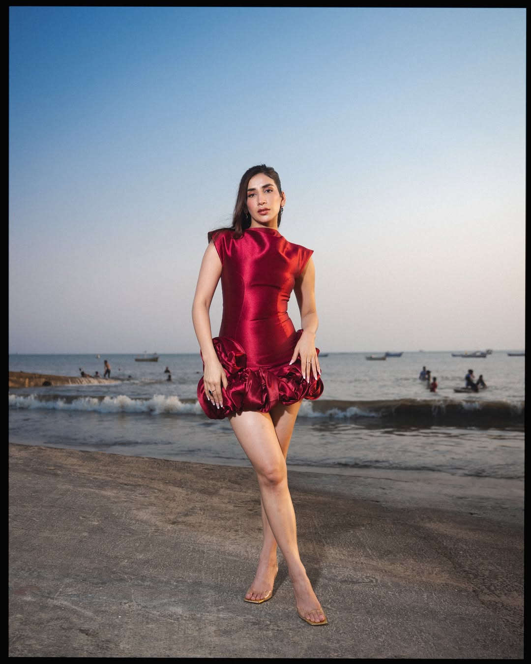 Parul wears a shiny red mini dress with a fitted look and ruffle design. The beach setting makes her style stand out more. (Image Courtesy: Instagram)